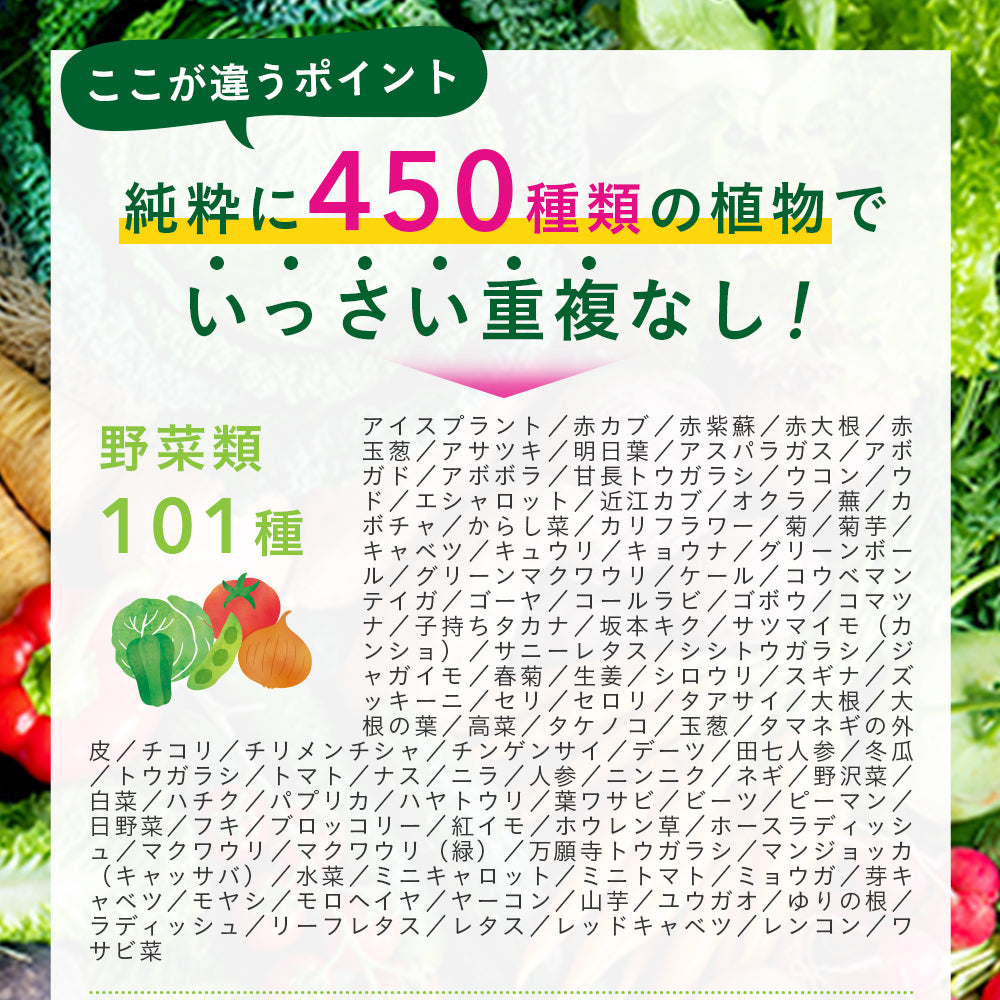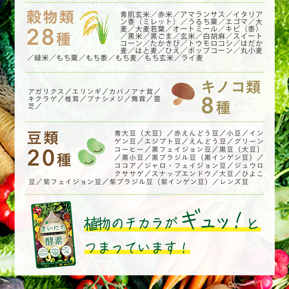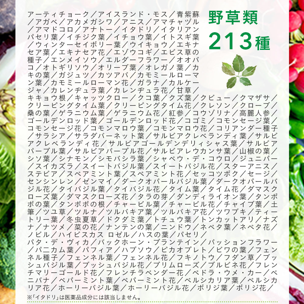 | 450種類一覧 | アーティチョーク、アイスプラント、アイスランド・モス、青紫蘇、青大豆(大豆)、青肌玄米、赤カブ、赤米、赤紫蘇、赤大根、赤玉葱、アガベ、赤えんどう豆、アカメガシワ、アガリクス、アケビ、アサイー、アサツキ、明日葉、小豆、アスパラガス、アセロラ、アテモヤ、アニス、アボガド、アボボラ、アマチャヅル、甘長トウガラシ、甘夏、アマドコロ、アマランサス、アムラ、アラサボイ、アナトー、アンズ、イタドリ、イタリアン黍(ミレット)、イタリアンパセリ葉、苺、イチジク、イチジク葉、イチョウ葉、イトスギ葉、伊予柑、インゲン豆、ウィンターセイボリー葉、ウイキョウ、ウコン、ウド、梅、うるち粟、温州みかん、エキナセア葉、エキナセア花、エゴマ、エジプト豆、エシャロット、エゾウコギ、エビス草の種子、エンメイソウ、エリンギ、エルダーフラワー、エルダーベリー、えんどう豆、近江カブ、大麦、大麦若葉、オオバコ、オトギリソウ、オートミール、オクラ、オリーブ葉、オレガノ葉、オレンジ、柿、カキの葉、カシュー・ナッツ、ガジュツ、カツアバ、カバノアナ茸、蕪、カボス、カボチャ、カムカム、カモミールローマン葉、カモミールローマン花、からし菜、ガラナ、カリフラワー、カリン、カルケージャ、カレンヂュラ葉、カレンヂュラ花、河内晩柑、甘草、キウイ・フルーツ、キキョウ根、菊、菊芋、キクラゲ、キビ(黍)、キャッツクロー、キャベツ、キュウリ、キョウナ、キヨミ、キンカン、グアバ、クコの実、クコ葉、クズ葉、クビュー、クプアス、クマザサ、グラビオーラ、クランベリー、クリーピングタイム葉、クリーピングタイム花、グリーンコーヒー、グリーンボール、グリーンマクワウリ、グリーンマンゴウ、グレープ、グレープフルーツ、クレソン、クローブ、黒フェイジョン豆、黒米、黒豆(大豆)、黒小豆、黒ごま、黒ブラジル豆(黒インゲン豆)、桑の葉、桑の実、ケール、ゲラニウム葉、ゲラニウム花、玄米、紅参、コウゾリナ、コウベマンテイガ、高麗人参、ココア、ゴーヤ、ゴールデンロッド葉、ゴールデンロッド花、コールラビ、コゴミ、ゴボウ、コマツナ、子持ちタカナ、コモンセージ葉、コモンセージ花、コモンマロウ葉、コモンマロウ花、コリアンダー種子、昆布、坂本キク、サツマイモ(カンショ)、サニーレタス、サラシア、サラダバーネット葉、サルビアクレベランディ葉、サルビアクレベランディ花、サルビアゴールデンデリィシャス葉、サルビアパープル葉、サルビアパープル花、サルビアレウカンサ葉、山椒の葉、椎茸、ジェニパプ、シークワーサー、シシトウガラシ、シソ葉、シナモン、シモバシラ葉、ジャガイモ、シャペウ・デ・コウロ、ジャロ・フェイジョン豆、ジュウロクササゲ、ジュニパー、春菊、生姜、シラヌイ(デコポン)、シロウリ、白胡麻、スイカズラ、スイートコーン、スイートスプリング、スイートバジル葉、スイートバジル花、スイカ、スギナ、スターアニス、スターフルーツ、スダチ、ズッキーニ、ステビア、スナップエンドウ、スペアミント葉、スペアミント花、セッコツボク、セージ、セリ、セロリ、センシンレン、ゼンマイ、ダークオパールバジル葉、ダークオパールバジル花、タアサイ、大根、大根の葉、大豆、橙、タイバジル葉、タイバジル花、タイム葉、タイム花、たかきび、高菜、タケノコ、タペレバ、ダマスクローズ葉、ダマスクローズ花、玉葱、タマネギの外皮、タラの芽、ダンディライオン葉、タンポポの葉、タンポポの根、チャービル葉、チャービル花、チャイブ葉、チコリ、チリメンチシャ、チンゲンサイ、土筆、ツユ草、ツルナ、ツルバキア葉、ツルバキア花、ツワブキ、ティートリー葉、デーツ、田七人参、冬瓜、冬虫夏草、梨、トウガラシ、トウモロコシ、ドクダミ葉、トチュウ葉、トマト、ドライプルーン、ドラゴンフルーツ、トンカットアリ、ナス、ナズナ、夏みかん、ナツメ、菜の花、ナンテンの葉、ニラ、人参、ニンドウ、ニンニク、根昆布、ネギ、ネペタ葉、ネペタ花、野沢菜、ノビル、のり、パイナップル、ハイビスカス ロゼル、白菜、ハスの葉、ハスカップ、パセリ、はだか麦、パタ・デ・ヴィカ、ハチク、バックホーン・プランテイン、ハッサク、パッションフラワー、パッションフルーツ、はと麦、バナナ、パ二カム葉、パパイア、パフィア、パプリカ、ハブソウ、ハヤトウリ、パラナッツ、葉ワサビ、ピカオプレト、ビーツ、ピーマン、ヒジキ、ひえ、日野菜、ヒバマタ、ひよこ豆、ビワ、ビワの葉、フェンネル種子、フェンネル葉、フェンネル花、フキ、フキノトウ、フダン草、ブッシュバジル葉、ブッシュバジル花、ブナシメジ、フノリ、ブラックベリー、ブラジルナッツ、プリムローズ、ブルーベリー、プルーン、ブルビネ花、フレンチマリーゴールド花、フレンチラベンダー花、ブロッコリー、ペドラ・ウメ・カー、紅イモ、ベニバナ、ペパーミ