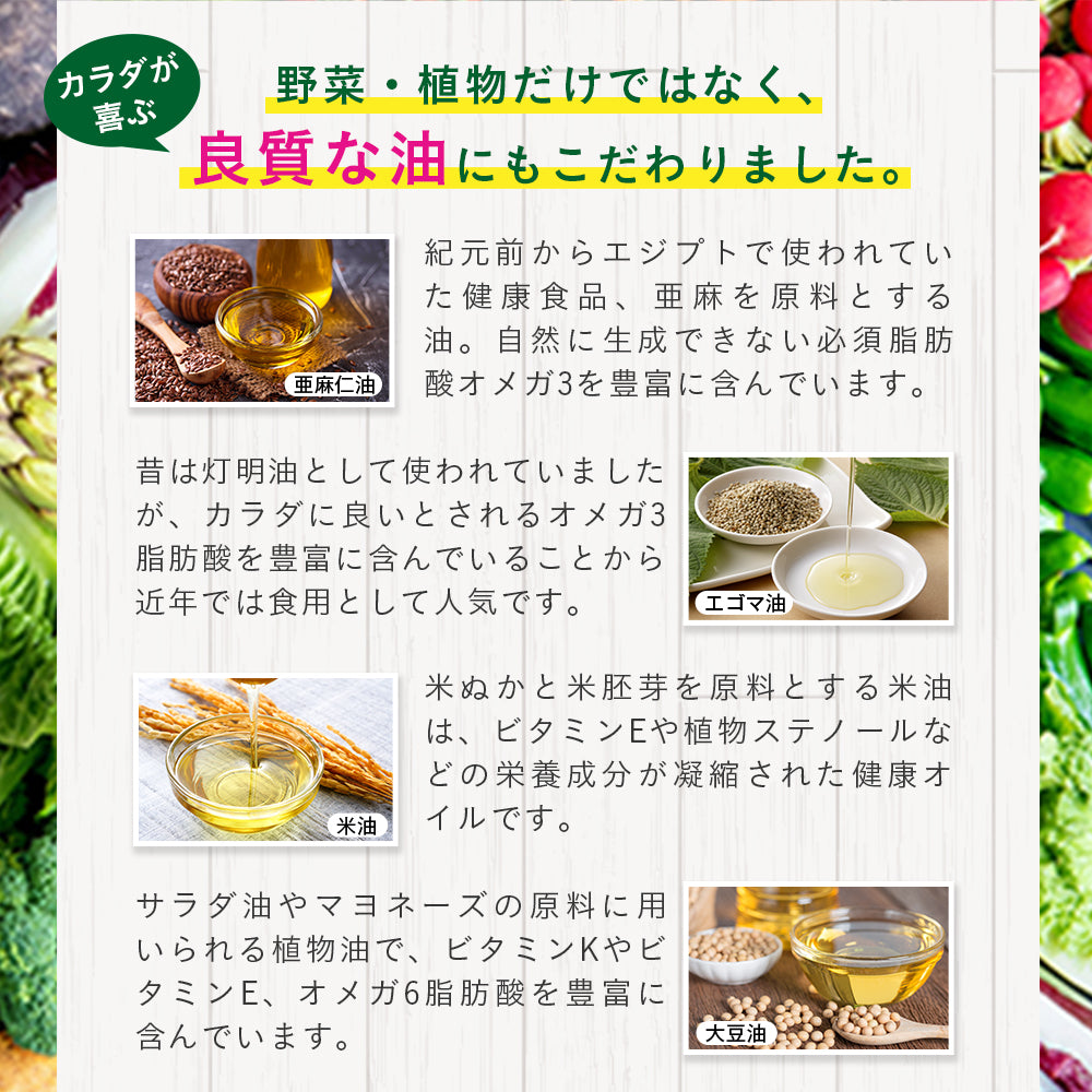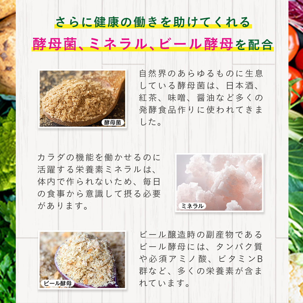 | 原材料 | 植物発酵エキス末(デキストリン、植物発酵エキス)(小麦・オレンジ・カシューナッツ・キウイフルーツ・ゴマ・大豆・バナナ・やまいも・りんごを含む)(国内製造)、こめ油、大豆油、アマニ油、えごま油、ビール酵母(大豆を含む)、酵母ペプチド、ミネラル含有酵母(亜鉛、マンガン、銅、ヨウ素、セレン、クロム、モリブデン含有)/ゼラチン、グリセリン、ミツロウ、グリセリン脂肪酸エステル、植物レシチン(大豆由来) |